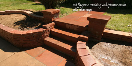 This project involved a fair amount of detailed planning as I was building into a finished yard with a predetermined walkway height. Working with this type of material can be quite unforgiving as it is not elastic or easily modified (and still keeping a natural look) – especially the larger monolithic pieces. Twenty-four inch squares were used on the walkway surface and 600 lbs steps were placed onto a custom support – a series of concrete cradles to hold the stones in place. The wall has a concrete block support with weep holes and gravel fill behind as well as a footer. 90% dry stacked and fitted. The two columns are lighted via glass block portals on two sides.